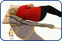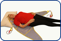 1Place the patient comfortably on their side (similar to that of the recovery position). Please lay out the sling as shown above in a half rolled out format.